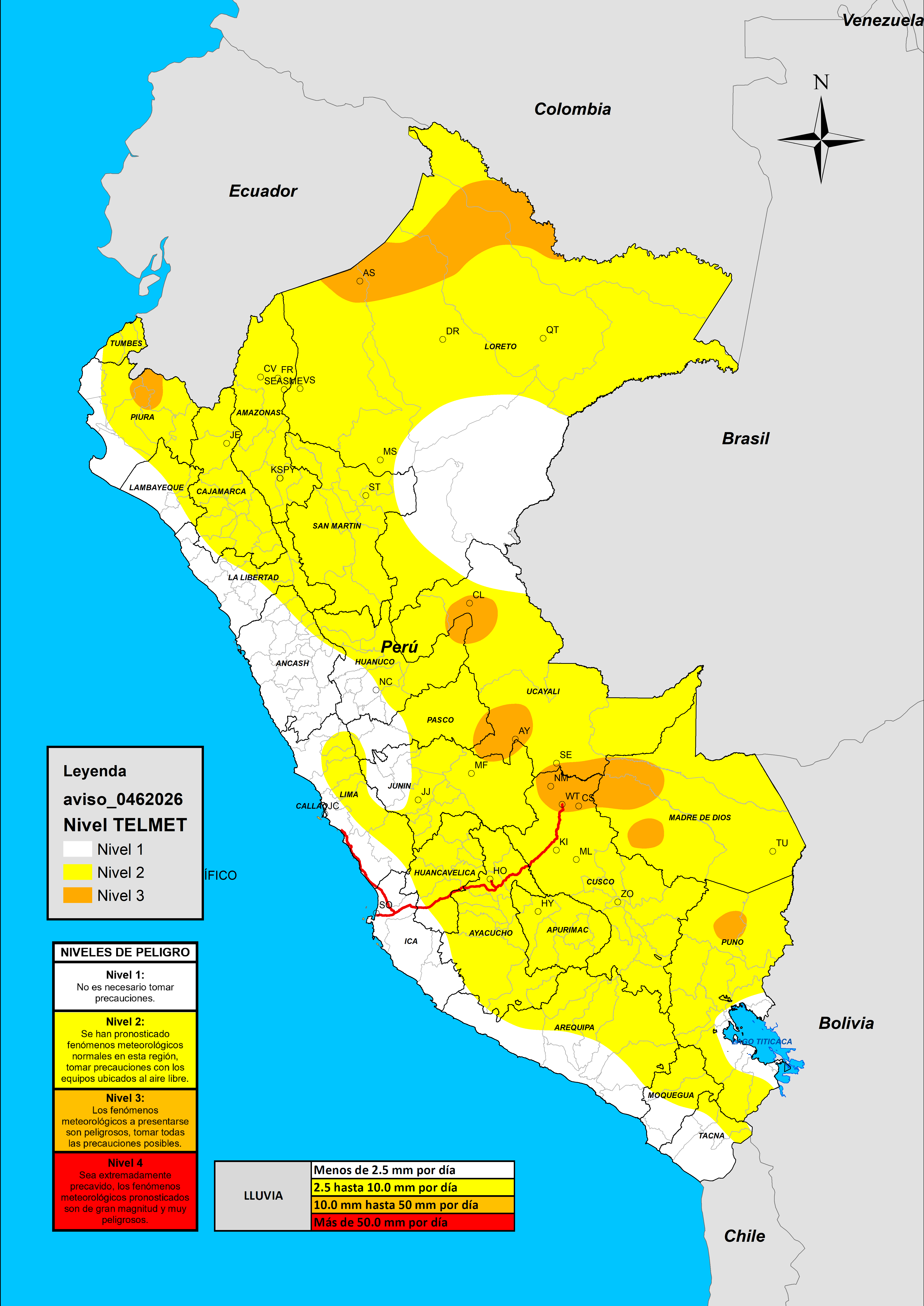 NORTE: Nuboso a cubierto; eventual nublado parcial en la tarde en algunos lugares. Cobertura con nubes bajas, cumuliformes y medias. Probables lluvias dispersas y tormentas eléctricas en gran parte de la región Amazonas, San Martín y en las provincias: Datem del Marañón, Alto Amazonas, Loreto, Maynas, Putumayo, Ramón Castilla, Ucayali. Lluvias moderadas en el norte de la región Loreto. Viento de hasta 06 nudos.